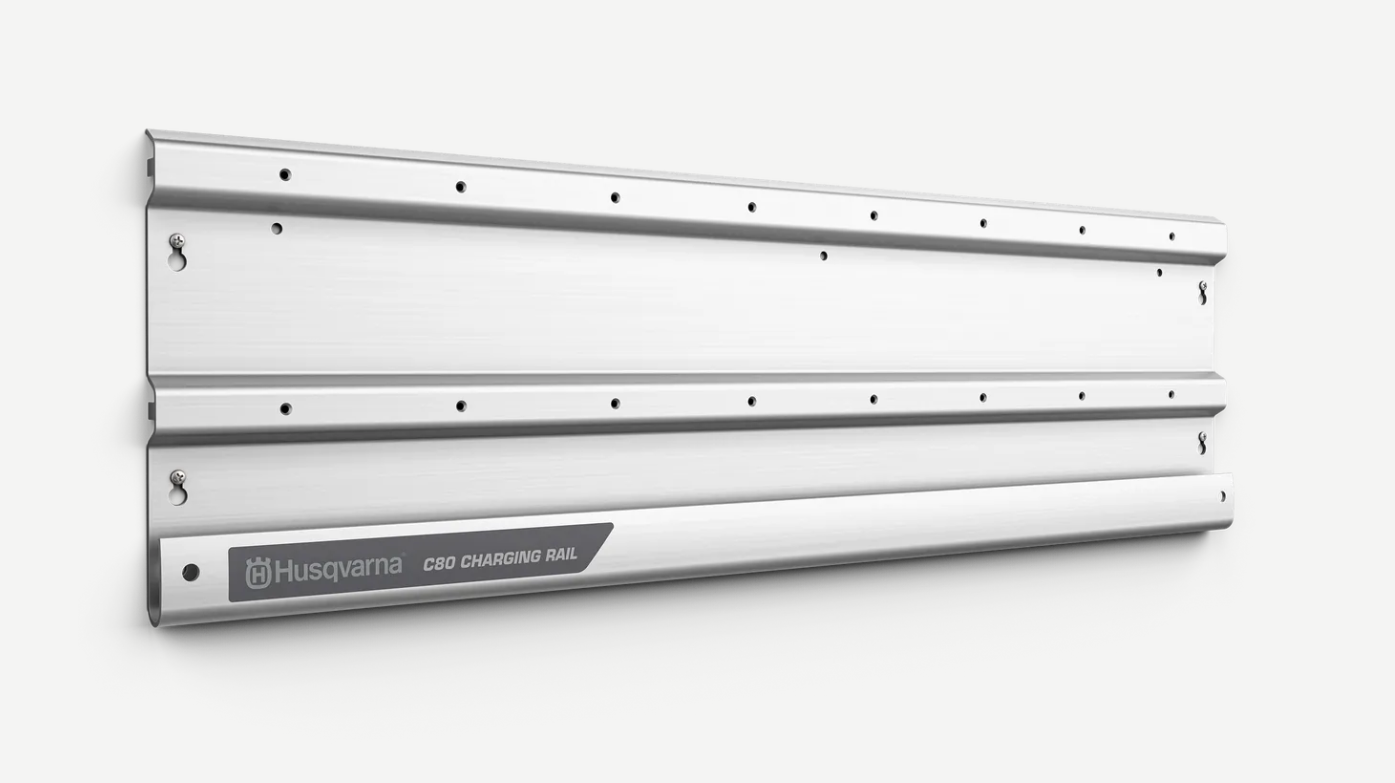 A Husqvarna töltősín kényelmes módot kínál akár nyolc C80 akkumulátor töltő csatlakoztatására. Ez az erős, kiváló minőségű alumíniumból készült sín biztonságosan a helyén tartja C80 töltőit, összekuszálódott kábelek nélkül. Helytakarékosság érdekében szerelje fel a sínt a műhely falára vagy polcára, vagy helyezze az asztalon vagy polcon fekvő gumilábakra. A 8-1 kábelcsatlakozáshoz csak egy fali aljzat szükséges az áramellátáshoz. A termék töltőt és akkumulátort nem tartalmaz.